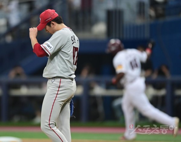 4일 서울 고척스카이돔에서 열린 ‘2022 신한은행 SOL KBO리그’ 키움 히어로즈와 SSG 랜더스의 경기에서 6회말 무사 키움에 솔로포를 허용한 SSG 오원석이 아쉬워하고 있다.