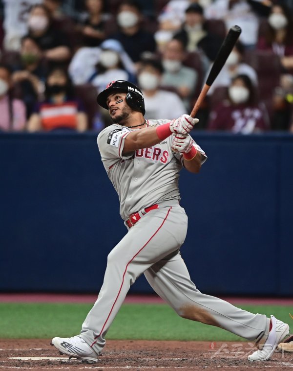 4일 서울 고척스카이돔에서 열린 ‘2022 신한은행 SOL KBO리그’ 키움 히어로즈와 SSG 랜더스의 경기에서 7회초 무사 SSG 라가레스가 좌월 솔로 홈런을 치고 있다.
