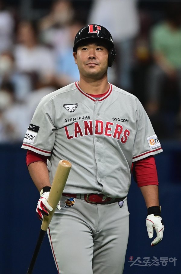 4일 서울 고척스카이돔에서 열린 ‘2022 신한은행 SOL KBO리그’ 키움 히어로즈와 SSG 랜더스의 경기에서 8회초 2사 만루 SSG 이재원이 삼진 아웃을 당한 후 아쉬워하고 있다.