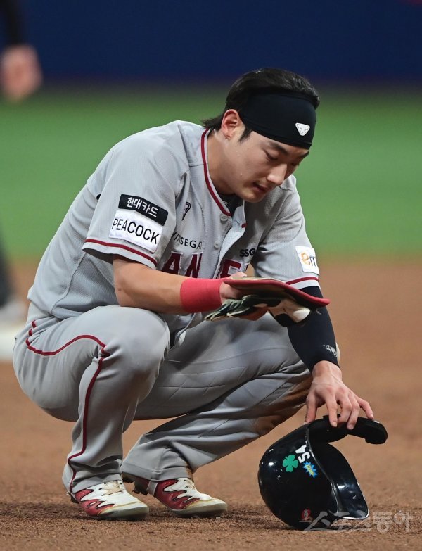 4일 서울 고척스카이돔에서 열린 ‘2022 신한은행 SOL KBO리그’ 키움 히어로즈와 SSG 랜더스의 경기에서 9회초 1사 3루 때 찬스를 날린 SSG 최지훈이 아쉬워하고 있다.