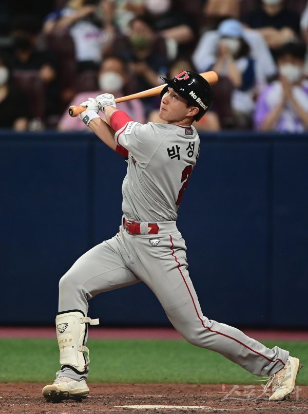 4일 서울 고척스카이돔에서 열린 ‘2022 신한은행 SOL KBO리그’ 키움 히어로즈와 SSG 랜더스의 경기에서 8회초 2사 만루 SSG 박성한이 동점 2타점 중전 2루타를 치고 있다.