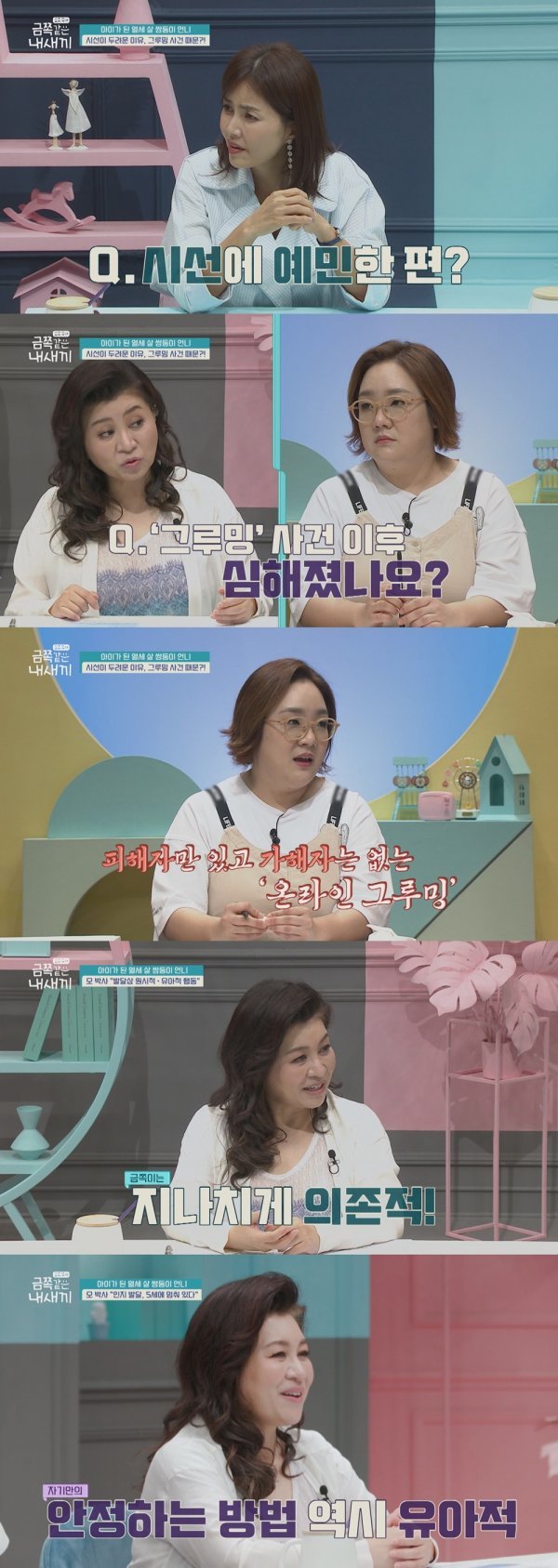 또한 일상적인 질문에도 불구하고 제대로 된 대답을 하지 못하고 아기 소리를 낸다거나, 보채면서 냄새를 맡는 등의 문제 행동을 언급하며 “금쪽이에겐 마음을 안정되게 하는 과정이긴 하지만 가장 초보적이고 원시적인 방법”이라고 일침을 가한다.