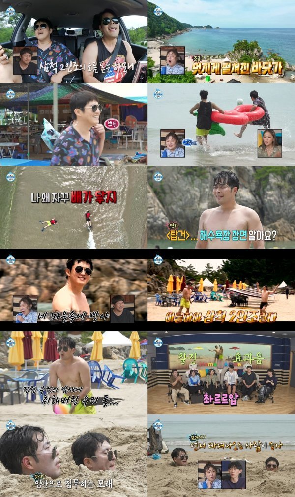민박집 인근 에메랄드빛 바다에 여행의 만족도는 최상급이었다. 그러나 민박집에 도착하자마자 “형 혹시..대변 봐도 돼요?”라고 양해를 구하는 김해준에게 \'찐\' 당황한 기안84의 모습은 폭소를 유발했다. 장을 비우는 것도 똑 닮은 기안84와 김해준은 삼척의 바다에서 칼각 헤엄부터 스노클링, 조개 잡기 등 \'물아일체\'로 시원함을 선사했다.