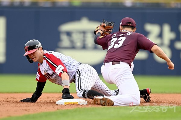 7일 서울 잠실야구장에서 ‘2022 신한은행 MY CAR KBO리그’ 키움 히어로즈와 LG 트윈스 경기가 열렸다. 3회말 1사 1루 상황에서 LG 1루주자 박해민이 2루 도루에 성공하고 있다.