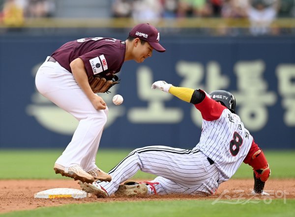 7일 서울 잠실야구장에서 ‘2022 신한은행 MY CAR KBO리그’ 키움 히어로즈와 LG 트윈스 경기가 열렸다. 4회말 무사 LG 문성주가 내야 땅볼을 치고 키움 송구 실책하는 사이 2루까지 달려 세이프 되고 있다.