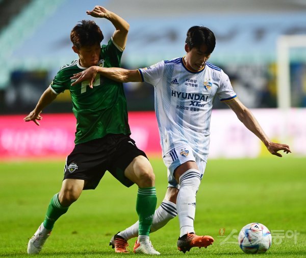 7일 전주월드컵경기장에서 열린 ‘하나원큐 K리그1 2022’ 전북 현대와 울산 현대의 경기에서 전북 김보경과 울산 설영우가 몸싸움을 하고 있다.