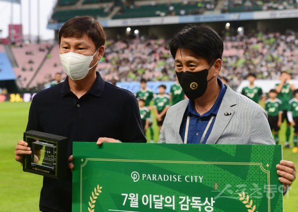 7일 전주월드컵경기장에서 열린 ‘하나원큐 K리그1 2022’ 전북 현대와 울산 현대의 경기에 앞서 전북 김상식 감독이 7월 이달의 감독상을 수상해 기념 촬영을 하고 있다.