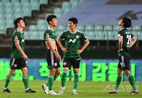 7일 전주월드컵경기장에서 열린 ‘하나원큐 K리그1 2022’ 전북 현대와 울산 현대의 경기에서 울산과 1-1 무승부로 승부를 가리지 못 한 전북 선수들이 아쉬워하고 있다.