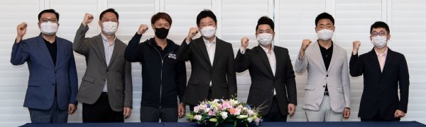 최상진 삼성전자판매 B2B그룹장, 이신우 삼성전자 한국총괄 프로, 미치리우 쎄타랩스 CEO, 정동성 신라면세점 부점장, 박동진 이크루즈 대표, 홍성환 쇼골프 본부장, 김경동 올링크 대표(왼쪽부터). 사진제공|삼성전자