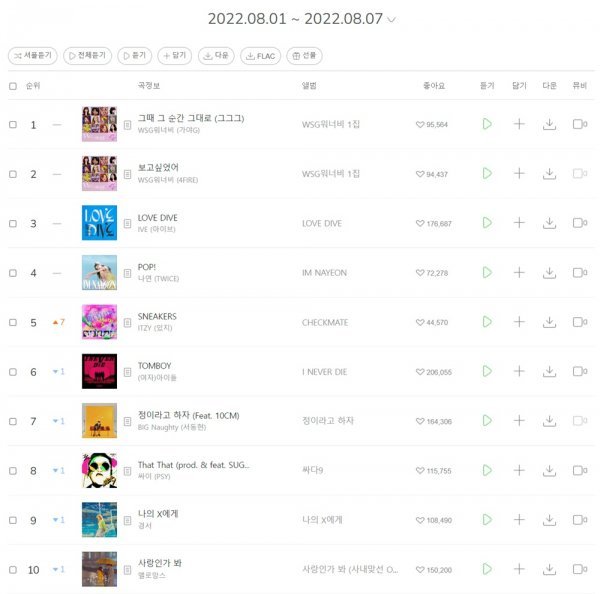 또 ITZY (있지)의 ‘SNEAKERS’는 7계단 상승해 5위에 올랐다. ‘탑건 : 매버릭 (Top Gun: Maverick)’ OST OneRepublic의 ‘I Ain\'t Worried’는 무려 23계단 상승해 63위를 기록하는 등 영화에 이어 OST도 뜨거운 열풍을 계속 이어가는 중이다.