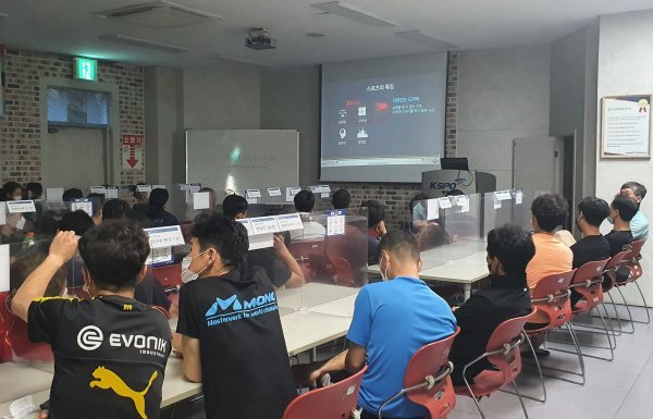 동영상 교육을 시청하고 있는 경정선수들. 사진제공 | 국민체육진흥공단