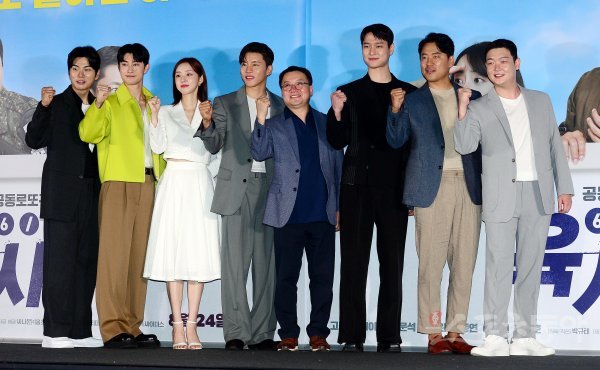 10일 오후 서울 용산구 CGV 용산아이파크몰에서 열린 영화 ‘육사오’의 언론시사회에 참석한 이이경, 곽동연 박세완, 음문석, 박규태 감독, 고경표, 이순원, 김민호가 포즈를 취하고 있다. ‘육사오’는 바람을 타고 군사분계선을 넘어가버린 57억 1등 로또를 둘러싼 남북 군인들간의 코믹 영화로 8월 24일 개봉한다.