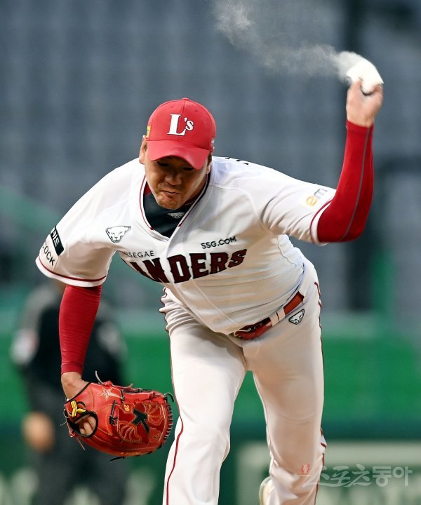 10일 인천 SSG 랜더스필드에서 ‘2022 신한은행 SOL KBO리그’ SSG 랜더스와 kt 위즈의 경기가 열렸다. SSG 선발투수 김광현이 3회초 2실점을 허용후 더그아웃으로 향하며 로진백을 던지고 있다.