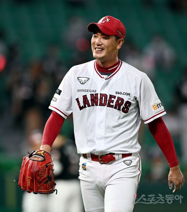 10일 인천 SSG 랜더스필드에서 ‘2022 신한은행 SOL KBO리그’ SSG 랜더스와 kt 위즈의 경기가 열렸다. 4회초 2사 만루에서 SSG 선발 김광현이 만루 위기를 넘긴 후 미소를 짓고 있다.