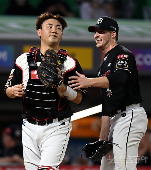 10일 인천 SSG 랜더스필드에서 ‘2022 신한은행 SOL KBO리그’ SSG 랜더스와 kt 위즈의 경기가 열렸다. 5회말 2사에서 kt 장성우가 플라이 타구를 잡은 후 벤자민의 격려를 받고 있다.