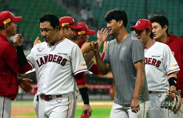 10일 인천 SSG 랜더스필드에서 ‘2022 신한은행 SOL KBO리그’ SSG 랜더스와 kt 위즈의 경기가 열렸다. SSG가 kt를 상대로 4-2 승리를 거둔 후 승리투수 김광현이 코치들의 환영을 받고 있다.