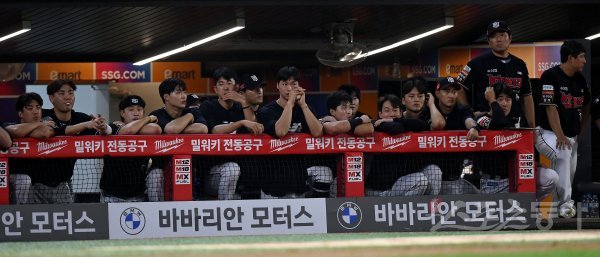 10일 인천 SSG 랜더스필드에서 ‘2022 신한은행 SOL KBO리그’ SSG 랜더스와 kt 위즈의 경기가 열렸다. 2-4로 뒤진 9회초 kt의 마지막 공격 때 선수들이 경기를 지켜보고 있다.