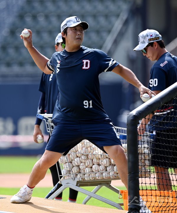 11일 서울 잠실야구장에서 ‘2022 신한은행 SOL KBO리그’ 두산 베어스와 NC 다이노스의 경기가 열린다. 경기 전 두산 배영수 코치가 배팅볼을 던지고 있다.