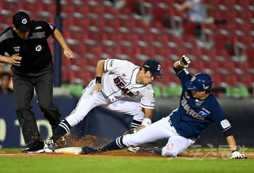 11일 서울 잠실야구장에서 ‘2022 신한은행 SOL KBO리그’ 두산 베어스와 NC 다이노스의 경기가 열렸다. 5회초 1사 2루에서 내야땅볼 때 두산 허경민이 NC 2루 주자 박민우를 3루에서 태그 아웃시키고 있다. 첫 판정은 세이프였으나 비디오판독 후 아웃.