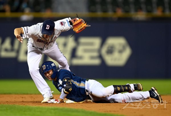 11일 서울 잠실야구장에서 ‘2022 신한은행 SOL KBO리그’ 두산 베어스와 NC 다이노스의 경기가 열렸다. 4회초 2사 만루에서 NC 박대온이 2타점 안타를 날린 후 2루에서 태그 아웃되고 있다.