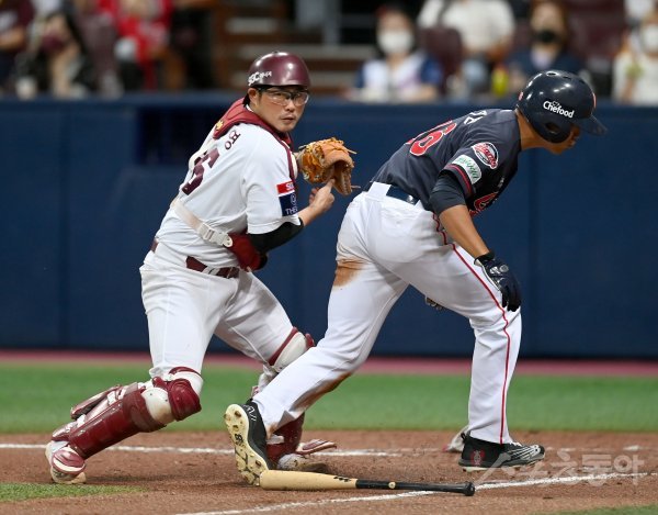 11일 서울 고척스카이돔에서 ‘2022 신한은행 MY CAR KBO리그’ 롯데 자이언츠와 키움 히어로즈 경기가 열렸다. 8회초 무사 1,2루 롯데 투수 앞 땅볼 때 키움 투수 2루로 악송구 하는 사이 2루주자 추재현이 홈으로 달렸으나 아웃되고 있다.