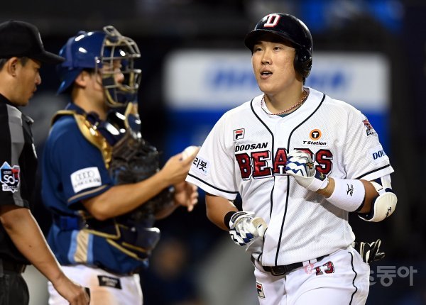 11일 서울 잠실야구장에서 ‘2022 신한은행 SOL KBO리그’ 두산 베어스와 NC 다이노스의 경기가 열렸다. 7회말 무사에서 두산 허경민이 동점 솔로 홈런을 쏘아 올린 후 그라운드를 돌며 환호하고 있다.