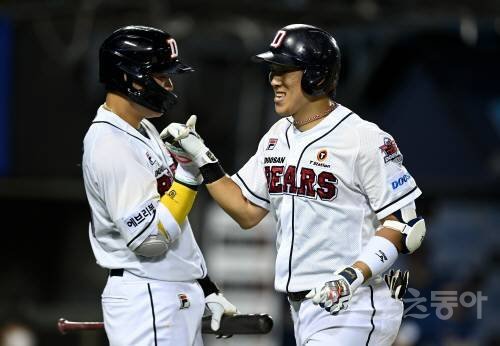 11일 서울 잠실야구장에서 ‘2022 신한은행 SOL KBO리그’ 두산 베어스와 NC 다이노스의 경기가 열렸다. 7회말 무사에서 두산 허경민이 동점 솔로 홈런을 쏘아 올린 후 동료와 기쁨을 나누고 있다.