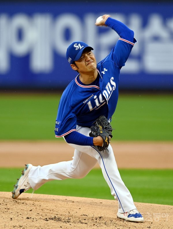 14일 경기도 수원 kt위즈파크에서 ‘2022 신한은행 SOL KBO리그’ kt 위즈와 삼성 라이온즈의 경기가 열렸다. 삼성 선발투수 백정현이 힘차게 볼을 던지고 있다.