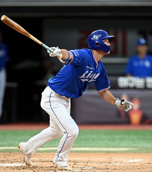 14일 경기도 수원 kt위즈파크에서 ‘2022 신한은행 SOL KBO리그’ kt 위즈와 삼성 라이온즈의 경기가 열렸다. 2회초 2사 만루에서 삼성 강한울이 2타점 적시타를 날리고 있다.