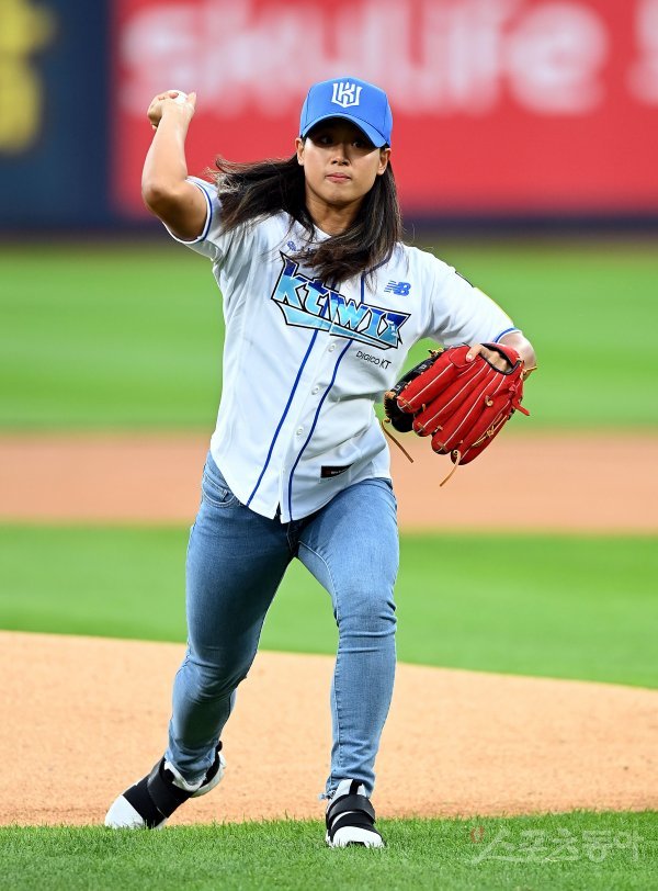 14일 경기도 수원 kt위즈파크에서 ‘2022 신한은행 SOL KBO리그’ kt 위즈와 삼성 라이온즈의 경기가 열렸다. ‘노는언지’에 출연중인 수영선수 정유인이 시구를 던지고 있다.
