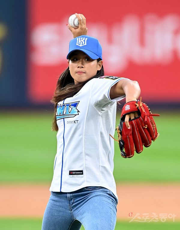 14일 경기도 수원 kt위즈파크에서 ‘2022 신한은행 SOL KBO리그’ kt 위즈와 삼성 라이온즈의 경기가 열렸다. ‘노는언지’에 출연중인 수영선수 정유인이 시구를 던지고 있다.