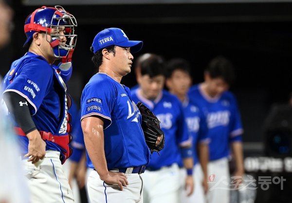 14일 경기도 수원 kt위즈파크에서 ‘2022 신한은행 SOL KBO리그’ kt 위즈와 삼성 라이온즈의 경기가 열렸다. 연장 10회말 1사 1, 2루에서 끝내기 안타를 허용한 삼성 오승환이 아쉬워하고 있다.