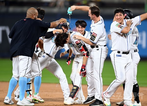 14일 경기도 수원 kt위즈파크에서 ‘2022 신한은행 SOL KBO리그’ kt 위즈와 삼성 라이온즈의 경기가 열렸다. 연장 10회말 1사 1, 2루에서 kt 심우준이 끝내기 안타를 날린 후 동료들의 물세례를 받고 있다.