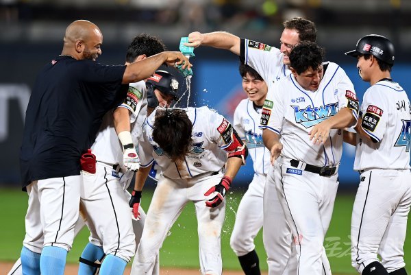 14일 경기도 수원 kt위즈파크에서 ‘2022 신한은행 SOL KBO리그’ kt 위즈와 삼성 라이온즈의 경기가 열렸다. 연장 10회말 1사 1, 2루에서 kt 심우준이 끝내기 안타를 날린 후 동료들의 물세례를 받고 있다.
