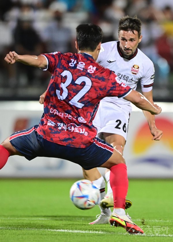 15일 경북 김천종합운동장에서 열린 ‘하나원큐 K리그1 2022’ 김천 상무와 FC서울의 경기에서 FC서울 팔로세비치가 김천 수비 앞에서 슛을 하고 있다.