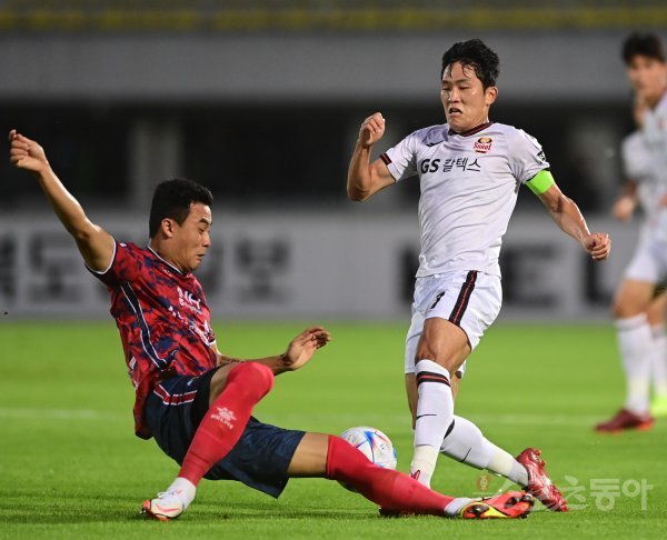 15일 경북 김천종합운동장에서 열린 ‘하나원큐 K리그1 2022’ 김천 상무와 FC서울의 경기에서 김천 박지수가 FC서울 나상호에게 태클을 하고 있다.