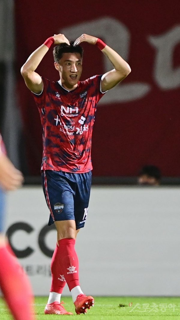 15일 경북 김천종합운동장에서 열린 ‘하나원큐 K리그1 2022’ 김천 상무와 FC서울의 경기에서 김천 김경민이 선제골을 성공시킨 후 세리머니를 하고 있다.