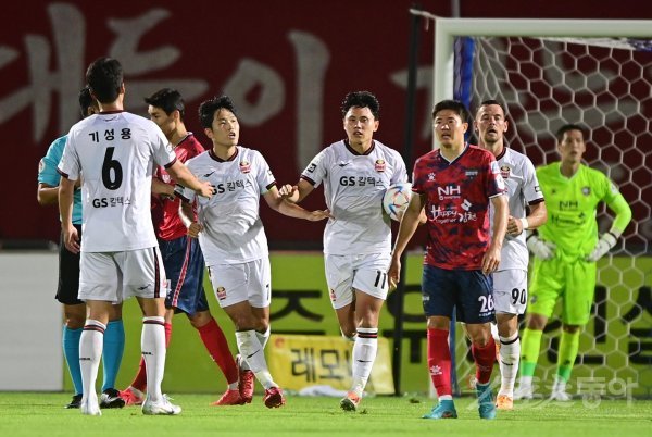 15일 경북 김천종합운동장에서 열린 ‘하나원큐 K리그1 2022’ 김천 상무와 FC서울의 경기에서 FC서울 조영욱이 동점골을 성공시킨 후 동료들의 축하를 받고 있다.