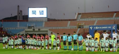 15일 경북 김천종합운동장에서 열린 ‘하나원큐 K리그1 2022’ 김천 상무와 FC서울의 경기에 앞서 광복절을 맞아 양 팀 선수들이 묵념을 하고 있다.
