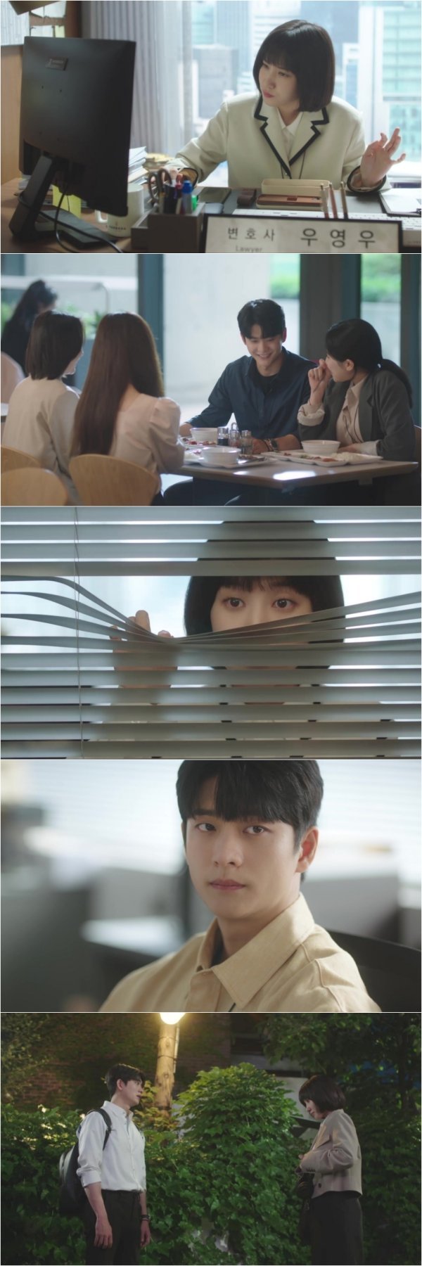 그런 가운데 공개된 사진에는 우영우, 이준호의 이별 후 일상이 담겨있다. 고래 이야기를 나누던 점심시간을 이젠 각자 보내는 두 사람. 자신의 방에서 ‘혼밥’ 중인 우영우는 다른 직원들에게 둘러싸여 식사 중인 이준호의 모습과 대비되며 안타까움을 더한다. 블라인드 틈으로 이준호를 훔쳐보는 우영우의 쓸쓸한 눈빛도 포착됐다. 가슴 아픈 말로 이별을 통보했지만 한번 피어난 마음은 쉽게 지지 않는다. 하지만 이유도 모른 채 이별을 받아들여야 하는 이준호의 마음도 혼란스럽기는 마찬가지. 우영우의 시선을 느낀 듯 고개를 돌린 그의 눈빛이 애틋하다. 다시 마주 선 우영우와 이준호, 과연 이준호는 우영우의 마음을 돌릴 수 있을지 이목이 집중된다.