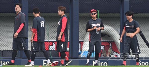 16일 광주기아챔피언스필드에서 열린 ‘2022 신한은행 SOL KBO리그’ KIA 타이거즈와 SSG 랜더스의 경기에 앞서 KIA 선수들이 외야에서 훈련 중 숨을 돌리고 있다.