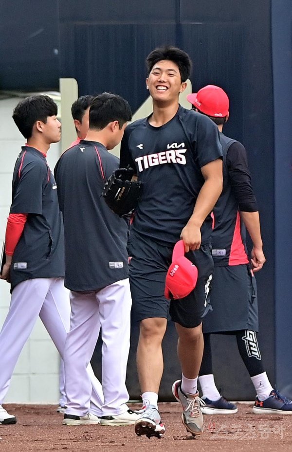 16일 광주기아챔피언스필드에서 열린 ‘2022 신한은행 SOL KBO리그’ KIA 타이거즈와 SSG 랜더스의 경기에 앞서 KIA 이의리가 동료와 장난을 치며 웃고 있다.