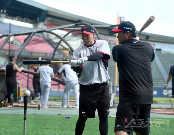 16일 서울 잠실야구장에서 ‘2022 신한은행 MY CAR KBO리그’ 삼성 라이온즈와 LG 트윈스 경기가 열린다. LG 김현수가 유강남에게 타격에 대해 조언하고 있다.