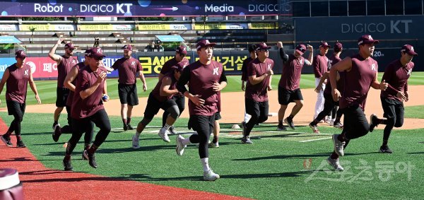 16일 경기도 수원 kt위즈파크에서 ‘2022 신한은행 SOL KBO리그’ kt 위즈와 키움 히어로즈의 경기가 열린다. 경기 전 키움 선수들이 스트레칭으로 몸을 풀고 있다.
