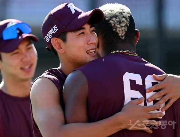16일 경기도 수원 kt위즈파크에서 ‘2022 신한은행 SOL KBO리그’ kt 위즈와 키움 히어로즈의 경기가 열린다. 경기 전 키움 이정후가 푸이그와 포옹을 나누고 있다.