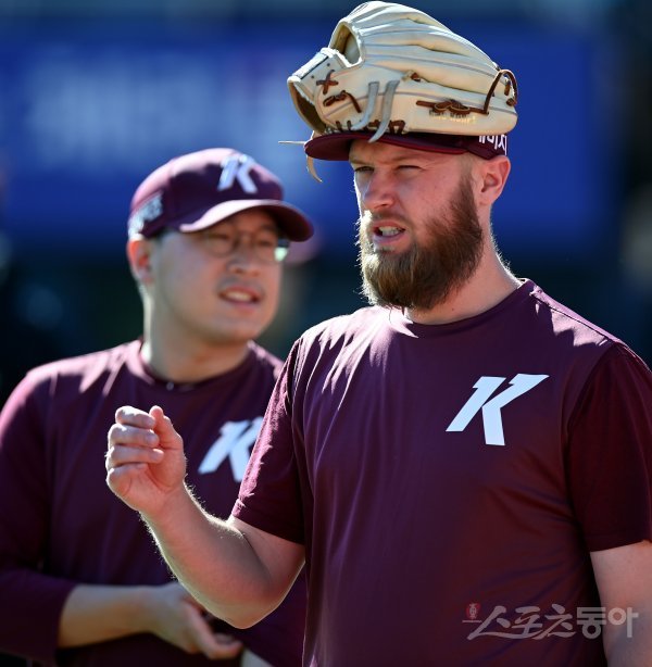 16일 경기도 수원 kt위즈파크에서 ‘2022 신한은행 SOL KBO리그’ kt 위즈와 키움 히어로즈의 경기가 열린다. 경기 전 키움 요키시가 머리에 글러브를 쓴 채 훈련을 준비하고 있다.