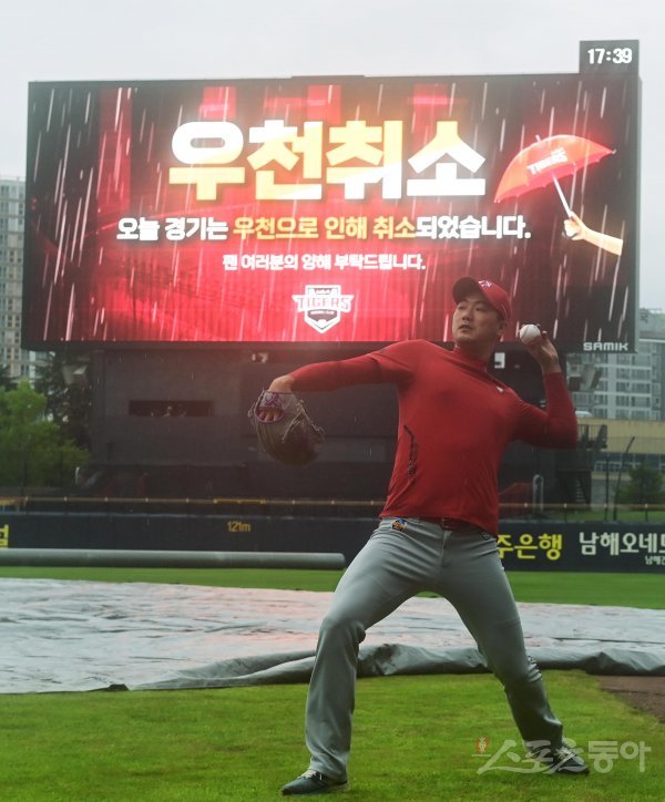 16일 광주기아챔피언스필드에서 열린 ‘2022 신한은행 SOL KBO리그’ KIA 타이거즈와 SSG 랜더스의 경기가 우천으로 취소됐다. 취소 결정 후 선발 투수로 예정됐던 SSG 김광현이 그라운드에서 캐치볼을 하고 있다.