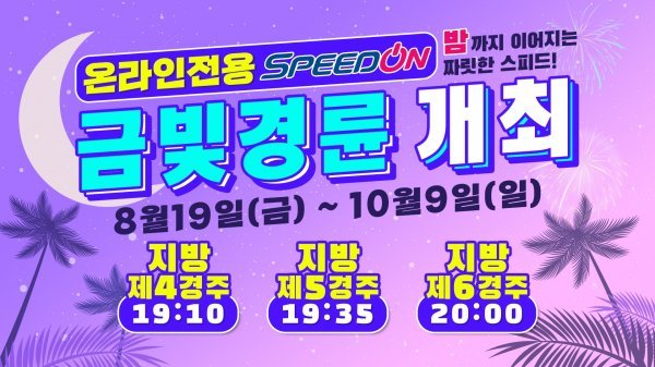국민체육진흥공단(이사장 조현재) 경주사업총괄본부는 스피드온 1주년을 기념하여 19일부터 10월 9일까지 ‘금빛경륜’ 경주를 시행한다. 이에 따라 부산지방공단스포원과 창원레포츠파크에서는 21∼23경주를 추가로 시행한다. 기존 20경주(지방 4경주, 광명 16경주) 종료 직후인 오후 7시10분 21경주를 시작으로 오후 8시(23경주)까지 진행한다. 19일 부산을 시작으로 창원과 매 회차별(금, 토, 일) 교대로 각각 4주씩 실시한다. 금빛경륜 기간 동안 고객참여 프로모션도 열린다. 정해진 기간별 스피드온을 통해 구매한 누적금액 상위자 400명에게 마일리지 혜택이 주어진다. 1차 프로모션 기간은 19일부터 9월 12일, 2차는 9월 16일부터 10월 9일이다.