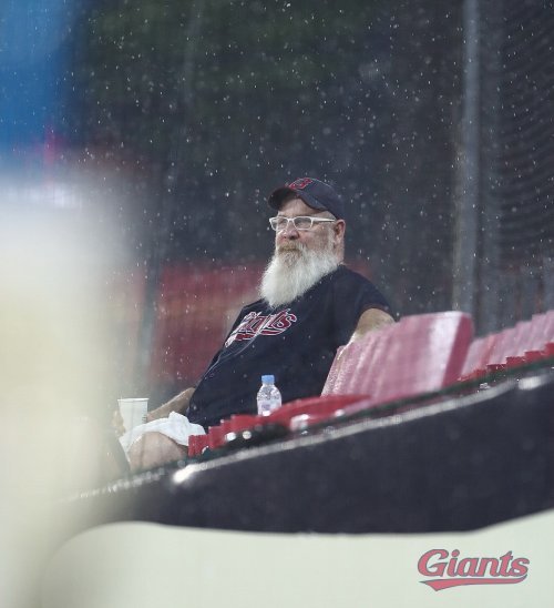 궂은 날씨에도 롯데 관중석을 지킨 마허 교수. 사진제공 | 롯데 자이언츠