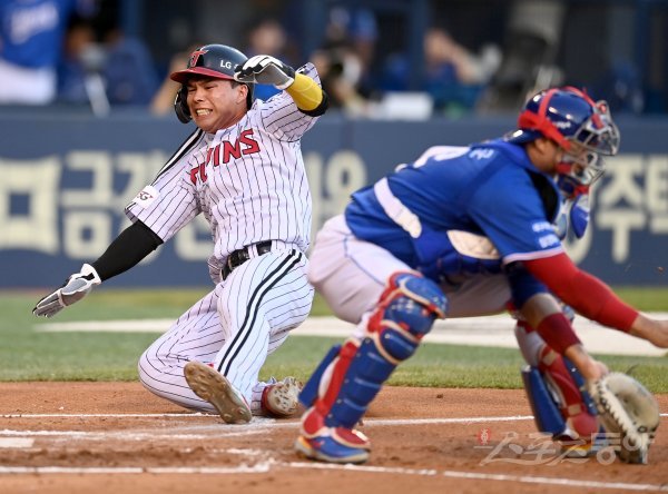 16일 서울 잠실야구장에서 ‘2022 신한은행 MY CAR KBO리그’ 삼성 라이온즈와 LG 트윈스 경기가 열렸다. 1회말 2사 2루 LG 안타 때 2루주자 문성주가 홈까지 달려 세이프 되고 있다.